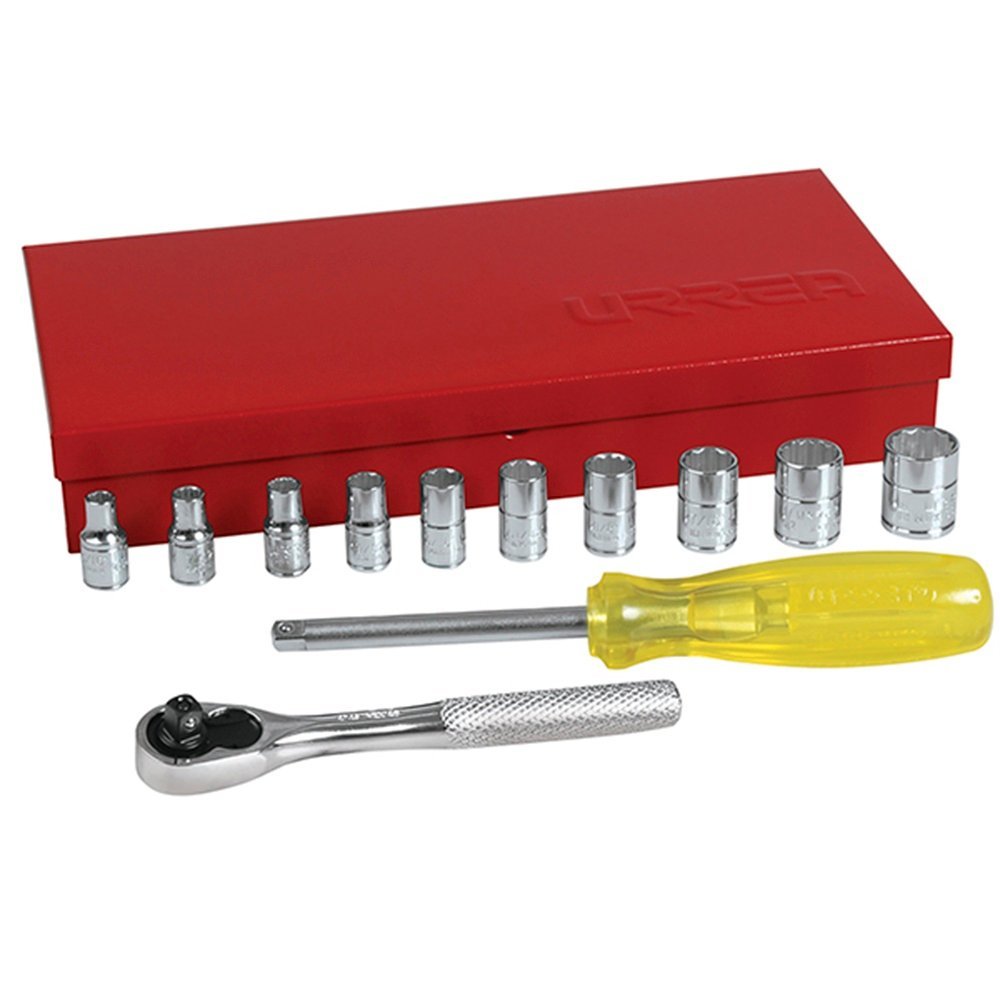 URREA | 47110 | JGO. DADOS Y ACCESORIOS CUADRO 1/4″ STD 12 PUNTAS 13 PZAS C/CAJA METALICA